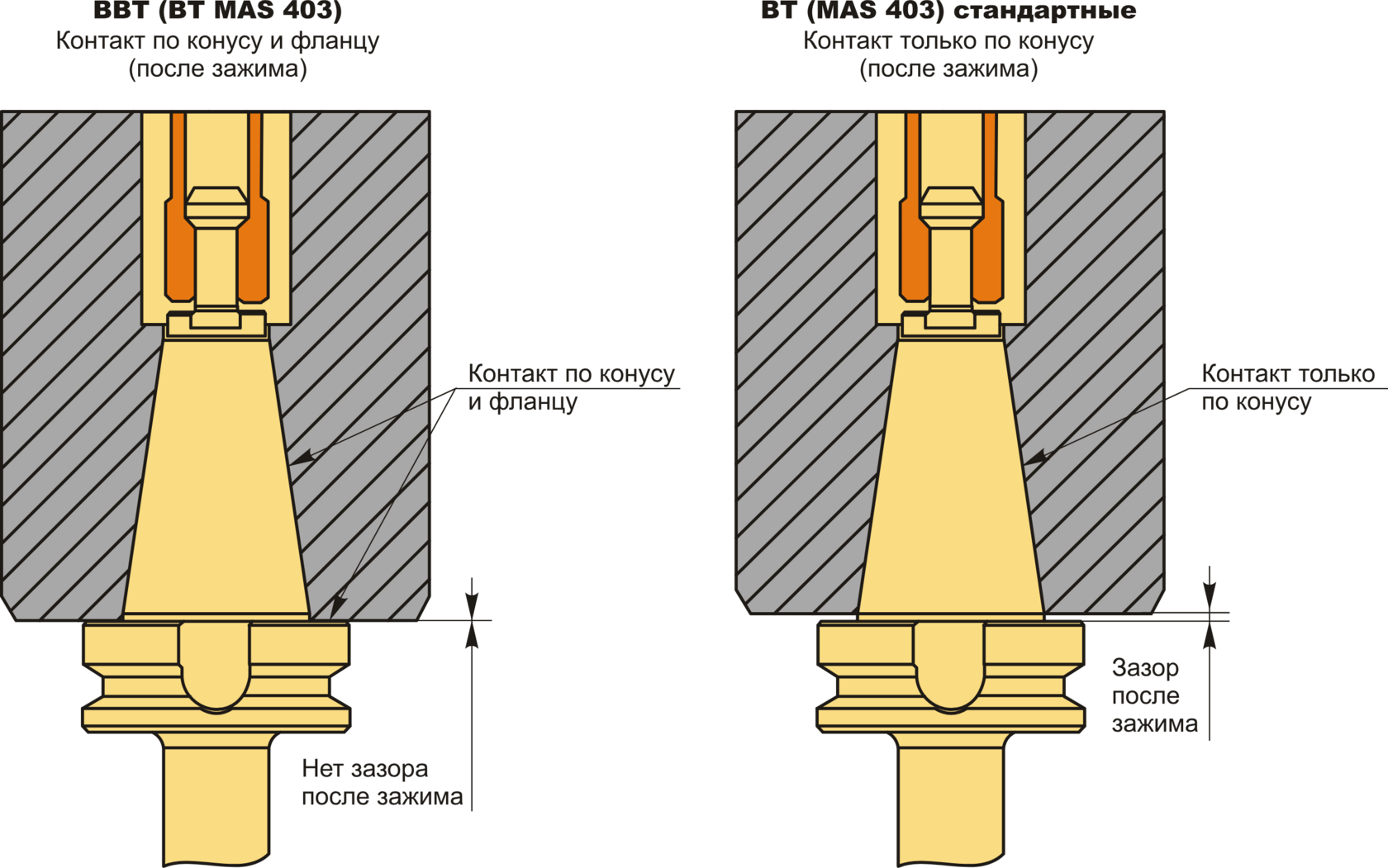 В среднем в 4 раза более жесткое закрепление инструментальной оправки в шпинделе станка по сравнению с BT благодаря большой площади контакта по торцу.